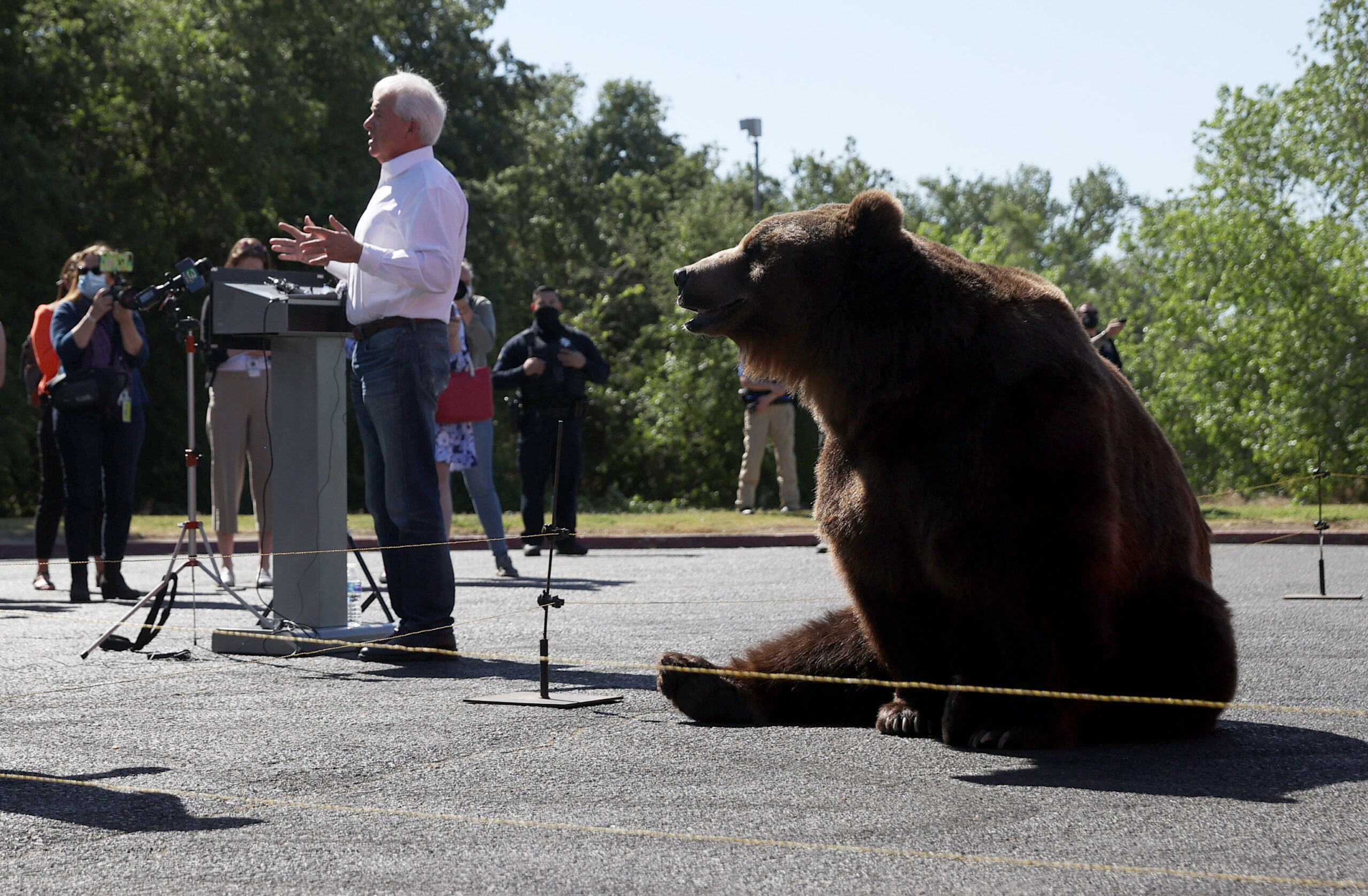 કેલિફોર્નિયાના રિપબ્લિકન ગવર્નર ઉમેદવાર જોહન કોક્સ 4 મે 2021ના રોજ મિલર રિજનલ પાર્કમાં કેમ્પેઇન રેલી દરમિયાન 1,000 પાઉન્ડનું રીંછ લાવ્યા હતા. (Photo by Justin Sullivan/Getty Images)