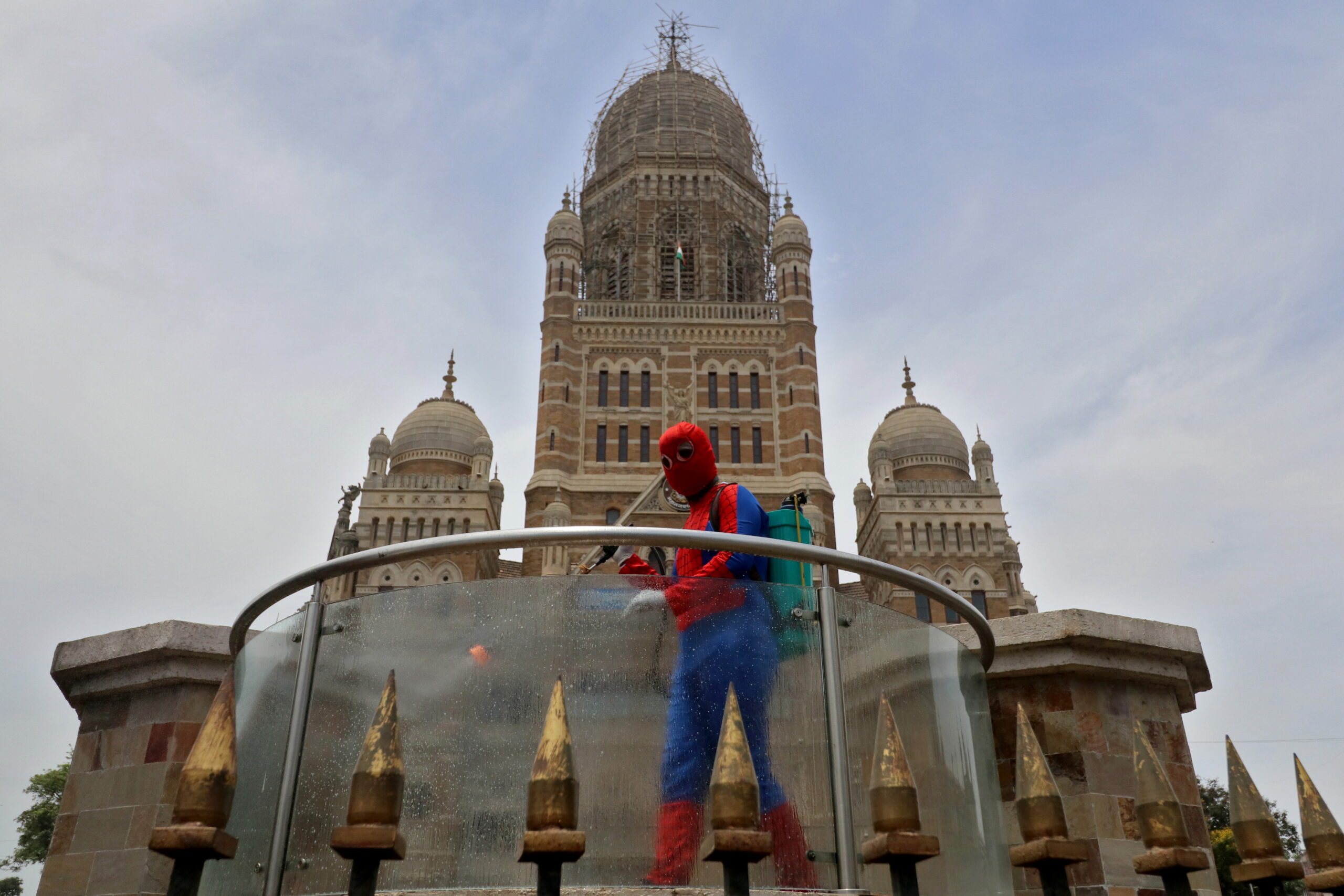 A man dressed as Spider-Man sanitizes a railing outside Chhatrapati Shivaji Maharaj Terminus (CSMT) railway station during a lockdown imposed to limit the spread of the coronavirus disease (COVID-19) in Mumbai, India, April 21, 2021. REUTERS/Niharika Kulkarni