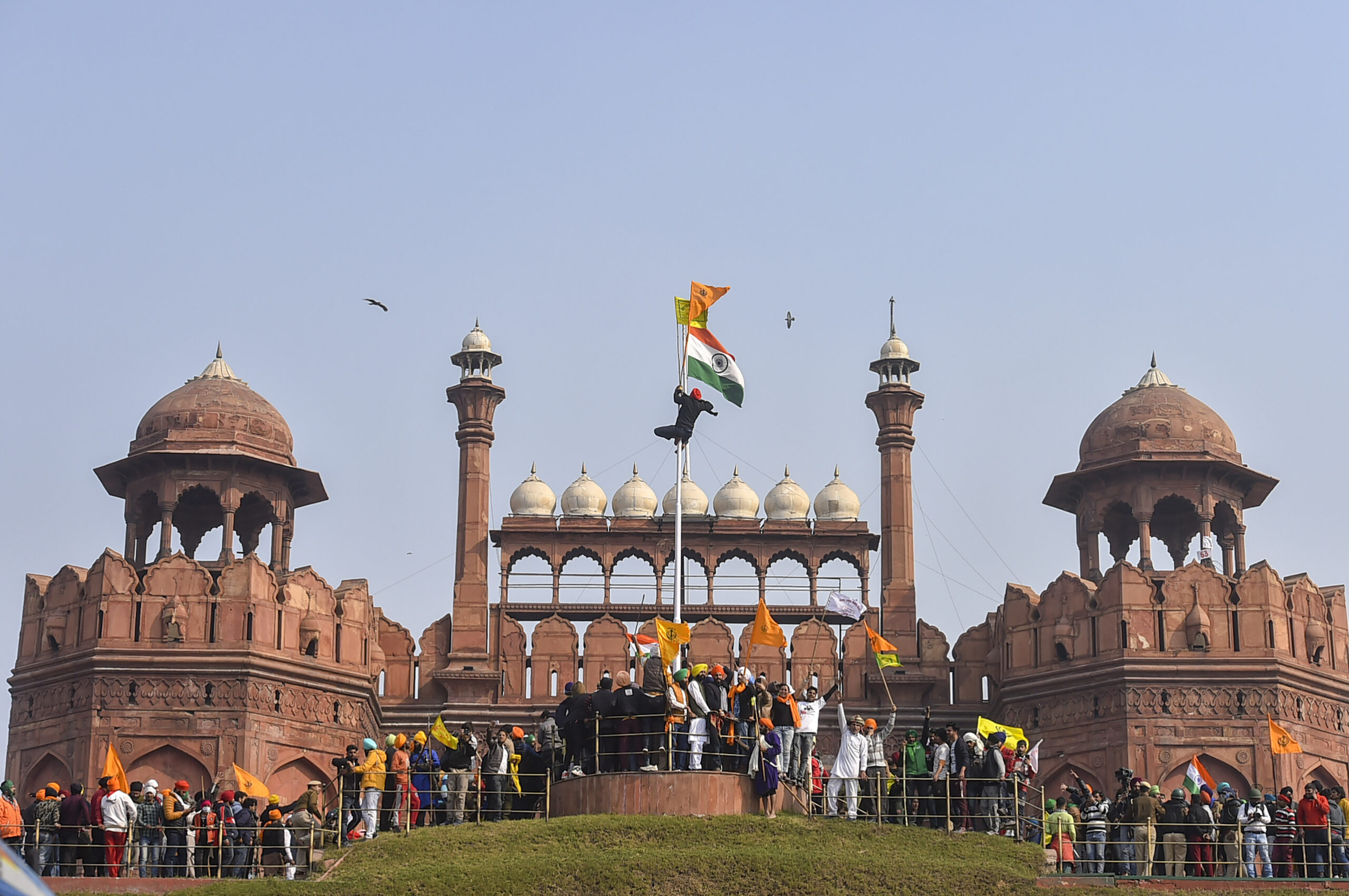 નવી દિલ્હીમાં આંદોલનકારી ખેડૂતોએ ટ્રેક્ટર રેલી દરમિયાન પ્રખ્યાત લાલ કિલ્લા પર પોતાનો ધ્વજ ફરકાવ્યો હતો અને ભારે અંધાધૂધી ફેલાવી હતી. (PTI Photo/Arun Sharma)