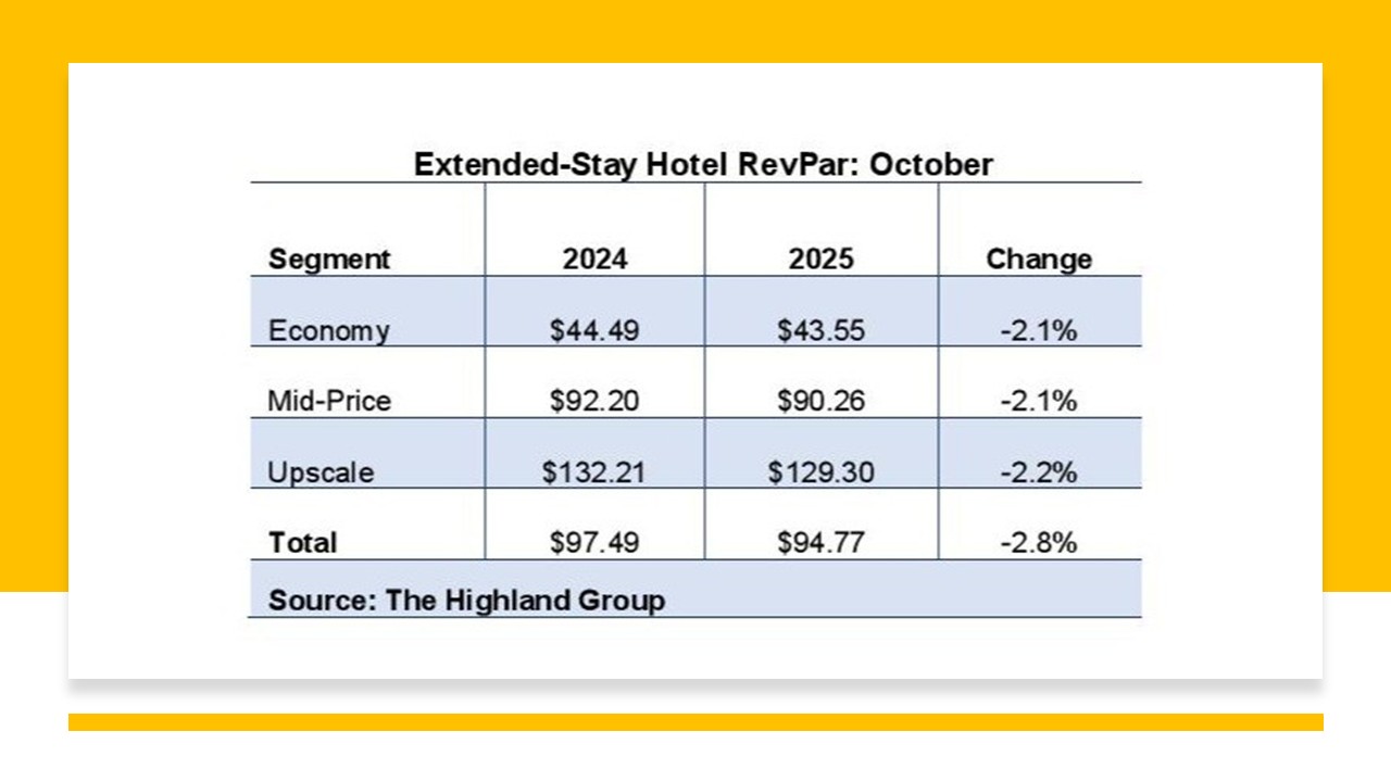 ધ હાઇલેન્ડ ગ્રુપ અનુસાર, ઓક્ટોબરમાં 7 મહિનાની ઉદ્યોગ મંદી દરમિયાન, ખાસ કરીને નીચા ભાવે, વિસ્તૃત રોકાણ કરતી હોટલોએ સ્થિતિસ્થાપકતા દર્શાવી. અર્થતંત્રમાં એક્સ્ટેન્ડેડ સ્ટે હોટલોમાં સતત પાંચ મહિના સુધી બધી ઇકોનોમી હોટલો કરતાં RevPAR ઘટાડો ઓછો હતો, જ્યારે છેલ્લા બે મહિનામાં એક્સ્ટેન્ડેડ સ્ટે હોટલોમાં બધી મિડ પ્રાઇસ્ડ હોટલો કરતાં અડધો ઘટાડો થયો હતો.