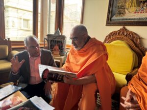 પૂજ્ય સ્વામીએ ગરવી ગુજરાત અને AMG ગ્રુપના સ્થાપક સ્વર્ગસ્થ શ્રી રમણીકલાલ સોલંકીને પ્રેમથી યાદ કર્યા હતા અને યુકેમાં ગુજરાતી સંસ્કૃતિ અને ભાષાના સંરક્ષણમાં તેમની મહત્વપૂર્ણ ભૂમિકા વિશે ઉષ્માભરી વાત કરી હતી. તેમણે બ્રિટિશ ડાયસ્પોરામાં ગુજરાતી વારસો, સમુદાય મૂલ્યો, વ્યવસાયિક શ્રેષ્ઠતા અને કલાને પ્રોત્સાહન આપવામાં ગરવી ગુજરાત, ઇસ્ટર્ન આઇ અને અન્ય AMG પ્રકાશનોના સતત યોગદાન બદલ પણ પ્રશંસા વ્યક્ત કરી હતી. આ પ્રસંગે પૂજ્ય સ્વામી જીને ગરવી ગુજરાત, ઇસ્ટર્ન આઇ, એશિયન ટ્રેડર, વડા પ્રધાન નરેન્દ્રભાઇ મોદીના 75મા જન્મ દિન વિશેષાંક અને દિવાળી અંક ભેટ કરાયા હતા.