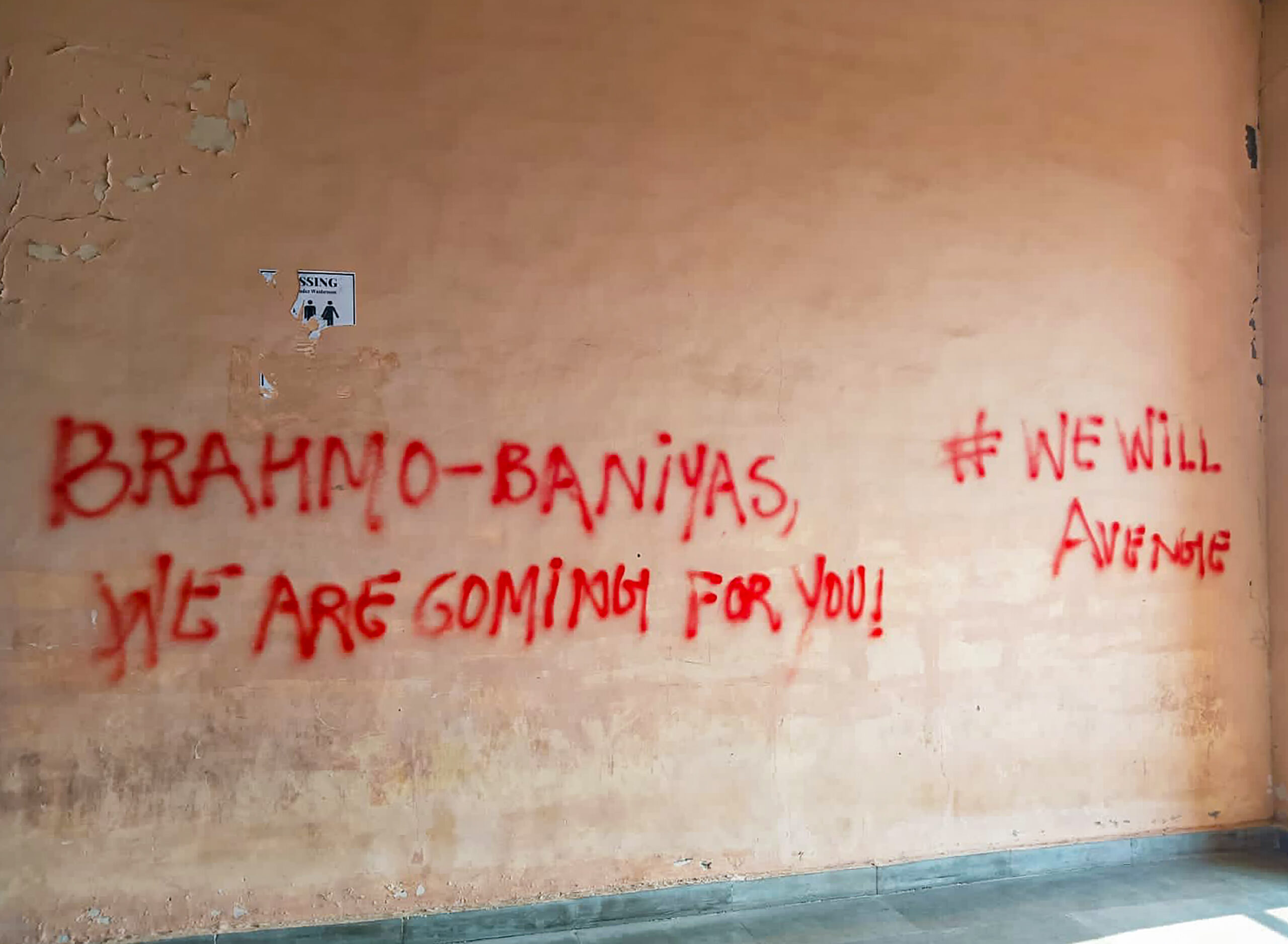 દિવાલ પર “બ્રાહ્મણો કેમ્પસ છોડો”, “બ્રાહ્મણ ભારત છોડો”, રક્તપાત થશે, અને “બ્રાહ્મણો-બનિયા, અમે બદલો લેવા માટે આવી રહ્યા છીએ! અમે બદલો લઈશું.” જેવા સૂત્રો લખવામાં આવ્યા હતા. RSS સંલગ્ન અખિલ ભારતીય વિદ્યાર્થી પરિષદે ડાબેરીઓ પર આ કૃત્યનો આક્ષેપ કર્યો હતો.