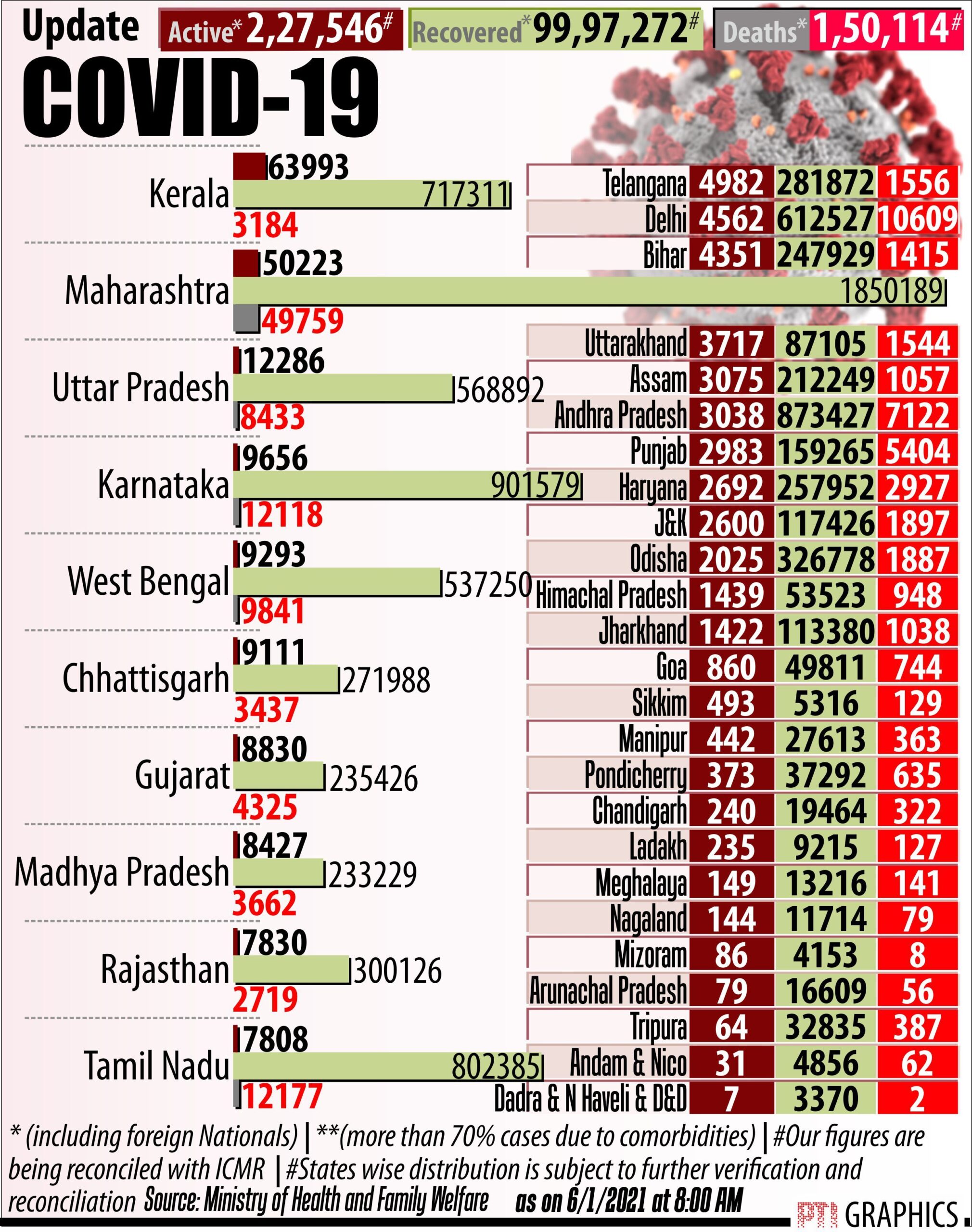 ભારત કોરોના વાયરસના કારણે 1.5 લાખથી વધુ લોકોના મૃત્યું પામ્યા હોય તેવો વિશ્વનો ત્રીજો દેશ બન્યો હતો. બુધવારે ભારતમાં કોરોનાનો કુલ મૃત્યુઆંક વધીને 1,50,111 થયો હતો. કેન્દ્રીય આરોગ્ય મંત્રાલયે બુધવારે સવારે આઠ વાગ્યે જારી કરેલા ડેટા અનુસાર દેશમાં છેલ્લાં 24 કલાકમાં 264 લોકોના મોત થયા હતા અને કોરોનાના નવા 18,088 કેસ નોંધાયા હતા. તેનાથી કુલ કેસની સંખ્યા 1,03,74,932 થઈ હતી. આની સામે 99.97 લાખ લોકો અત્યાર સુધી રિકવર થયા હતા.