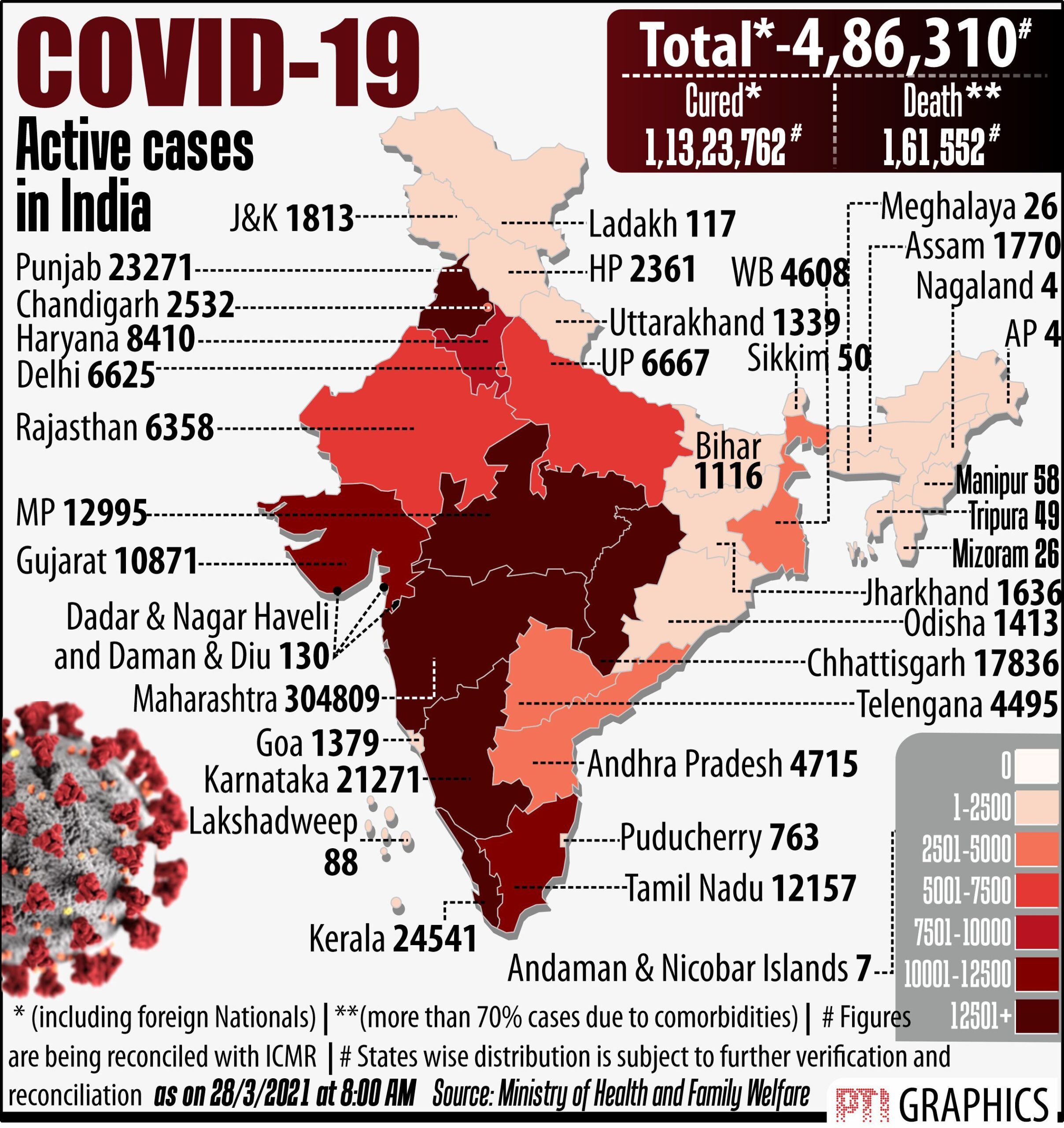 દેશના કુલ નવા કેસમાંથી 80.17 ટકા કેસ મહારાષ્ટ્ર, કેરળ, પંજાબ, કર્ણાટક અને છત્તીસગઢમાં નોંધાયા હતા. દેશમાં અત્યાર સુધી 6.05 કરોડ વેક્સીન ડોઝ આપવામાં આવ્યા છે.