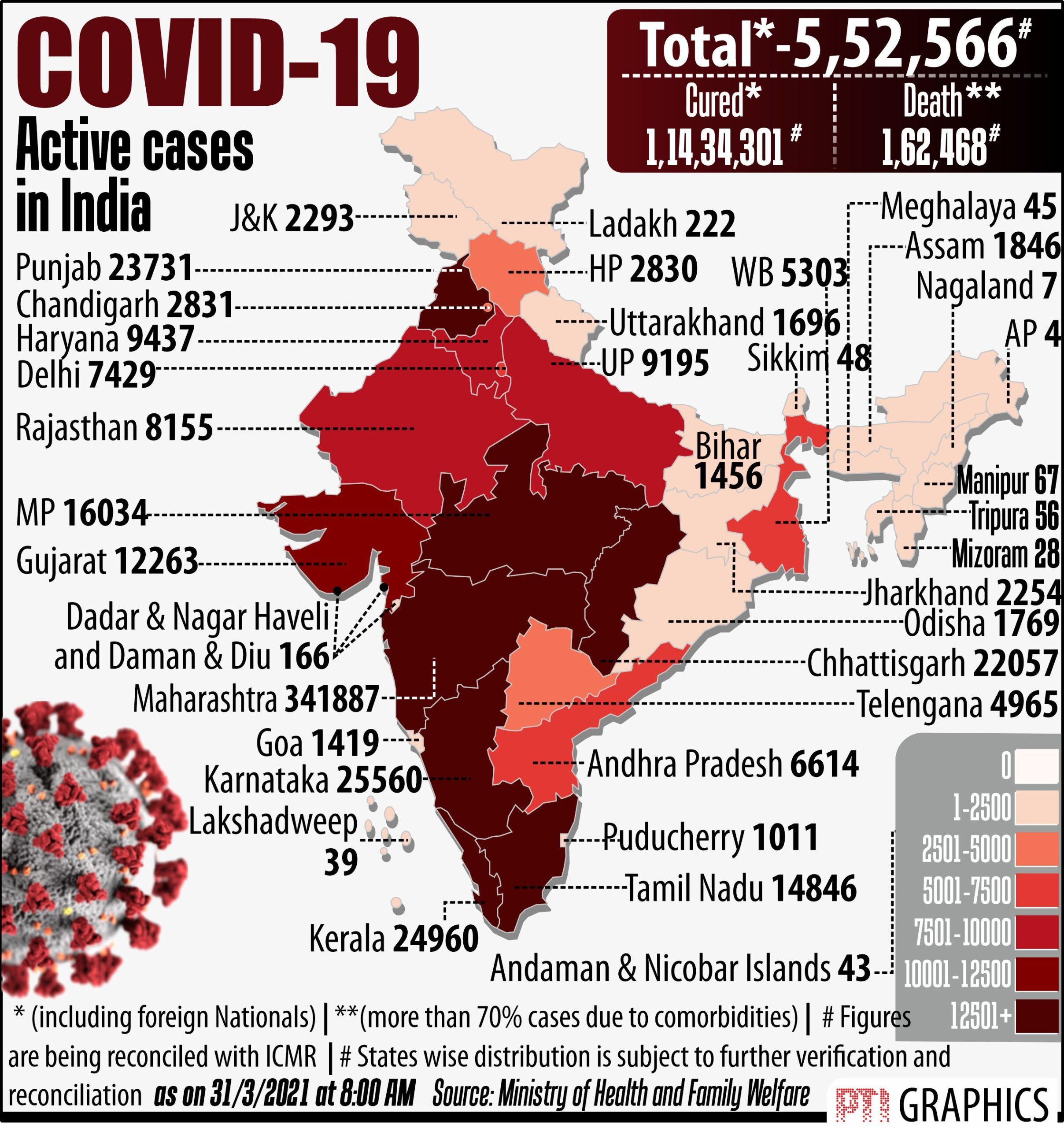 ભારતમાં કોરોનાના એક્ટિવ કેસનો આંકડો 5,52,566 થઈ ગયો છે, જેની કુલ કેસના 4.55% થાય છે. જ્યારે કોરોનાને હરાવીને સાજા થનારા દર્દીઓની ટકાવારી 94.11 ટકા થાય છે. ભારતમાં કોરોનાને હરાવીને 1,14,34,301 લોકો સાજા થઈ ગયા છે. કોરોનાનો મૃત્યુદર 1.34% થયો હતો.