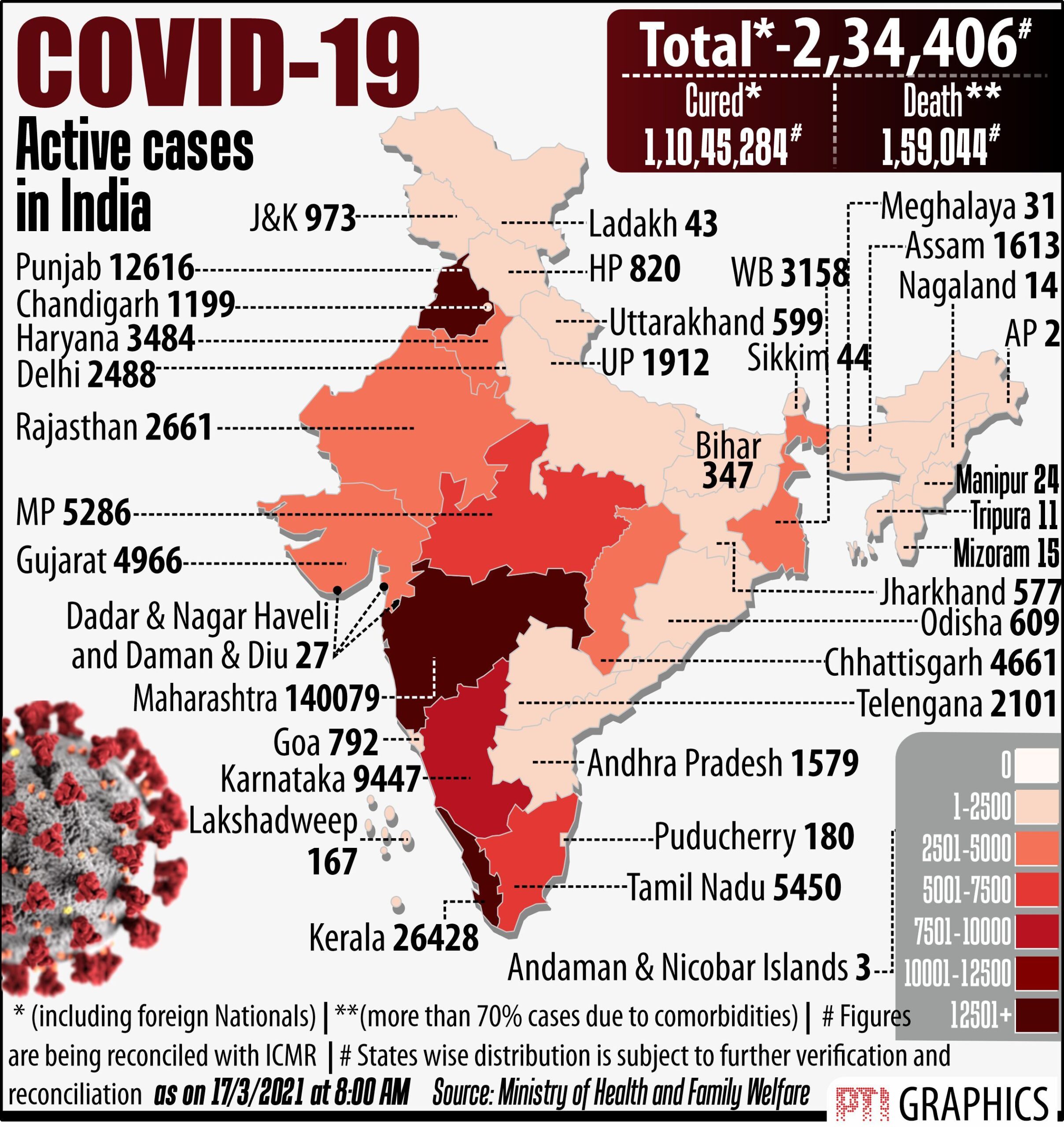 ભારતમાં મહારાષ્ટ્ર, પંજાબ, કર્ણાટક, ગુજરાત, તમિલનાડુમાં નવા કેસની સંખ્યા દેશના કુલ કેસોની આશરે 71.10 ટકા છે. મહારાષ્ટ્રમાં બુધવારે કોરોના વાઇરસના 17,864 કેસ નોંધાયા હતા, જે સમગ્ર દેશમાં નોંધાયેલા કુલ કેસના 61.8 ટકા હતા.