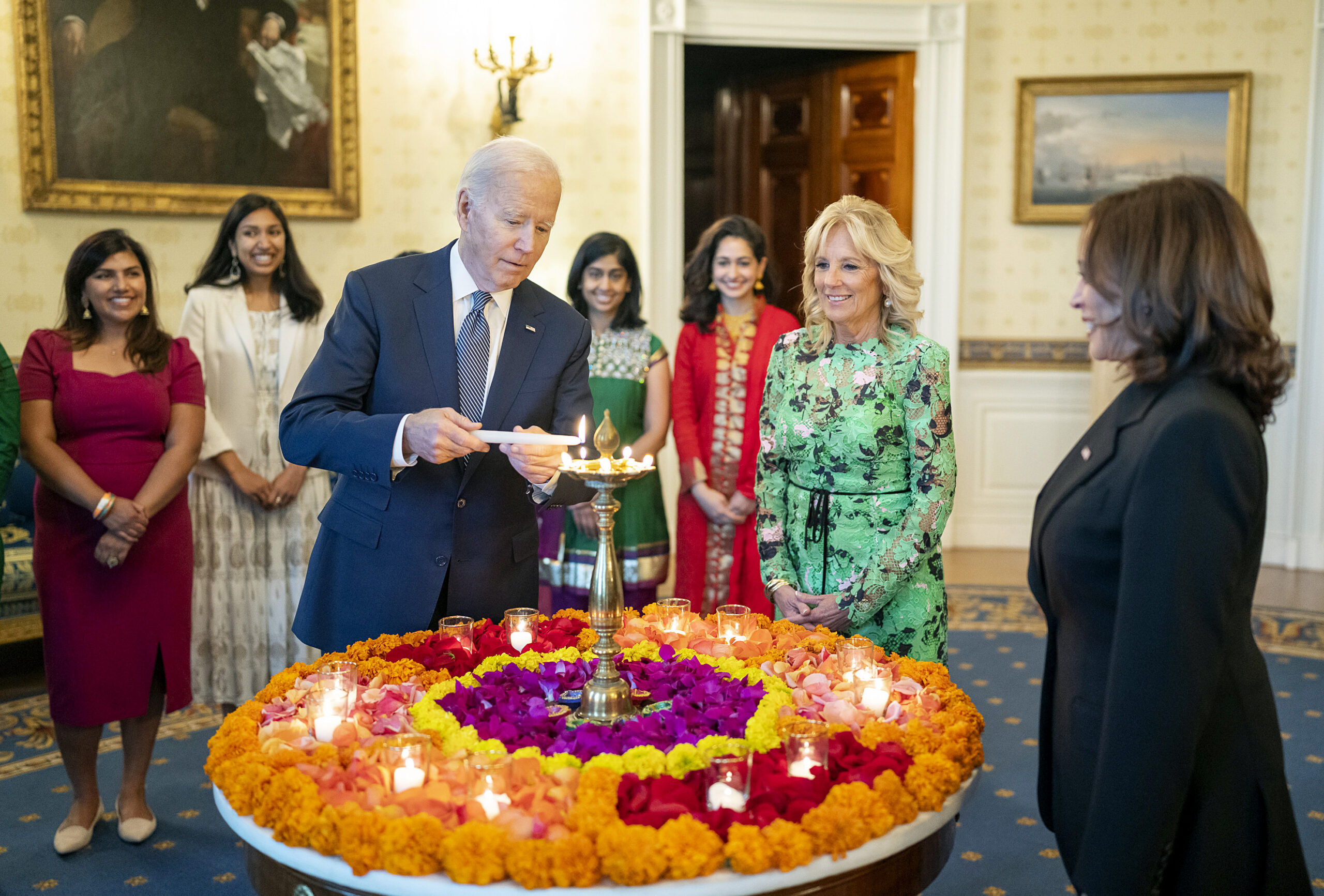 વ્હાઇટ હાઉસમાં દિવાળીની ઉજવણીના કાર્યક્રમમાં પ્રેસિડન્ટ જો બાઇડને જણાવ્યું હતું કે અમે તમને આવકારતા સન્માનિત થયા છીએ. વ્હાઇટ હાઉસમાં આટલા મોટા પ્રમાણમાં દિવાળીની પ્રથમ ઉજવણી છે. ઈતિહાસમાં અત્યાર સુધીના સૌથી વધુ એશિયન અમેરિકનો ઉપસ્થિત છે અને અમે દિવાળીની ઉજવણીને અમેરિકન સંસ્કૃતિનો આનંદદાયક ભાગ બનાવવા બદલ તમારો આભાર માનવા માંગીએ છીએ.” આ સમયે ફર્સ્ટ લેડી જિલ બાઈડેન, નાયબ પ્રમુખ કમલા હેરિસ સહિત ભારતીય મૂળના ૨૦૦થી વધુ લોકો હાજર રહ્યા હતા. તેઓ પરંપરાગત ભારતીય પહેરવેશ શેરવાની, સાડીમાં પહોંચ્યા હતા અને આ રંગારંગ કાર્યક્રમમાં સિતારવાદક ઋષભ વર્માએ પરફોર્મ કર્યું હતું. કાર્યક્રમમાં મહેમાનોએ ભારતીય મીઠાઈઓનો સ્વાદ માણ્યો હતો. વ્હાઈટ હાઉસમાં સોમવારની રાતે દિવાળી પાર્ટીનું આયોજન કરાયું હતું. વ્હાઈટ હાઉસમાં આ વર્ષના દિવાળી સમારંભમાં પ્રમુખ જો બાઈડેને મંચ પર બે બાળકોને બોલાવ્યા હતા અને તેમને પ્રકાશપુંજ તરીકે ઓળખાવ્યા હતા.