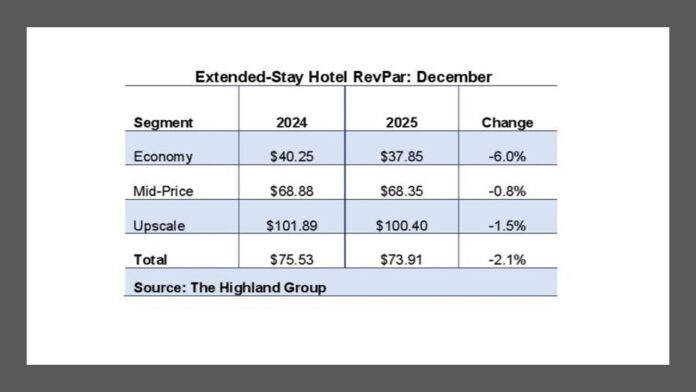 ડિસેમ્બરમાં એક્સટેન્ડેડ-સ્ટે હોટેલમાં સ્થિરતાના સંકેતો દર્શાવવામાં આવ્યા હતા, જેમાં હાઇલેન્ડ ગ્રુપ અનુસાર, એપ્રિલ પછીનો સૌથી નાનો માસિક ઘટાડો, RevPAR 2.1 ટકા ઘટ્યો હતો. વધુમાં, એક્સટેન્ડેડ-સ્ટે ઓક્યુપન્સી એકંદર હોટેલ ઉદ્યોગ કરતા 14.6 ટકા વધુ હતી.