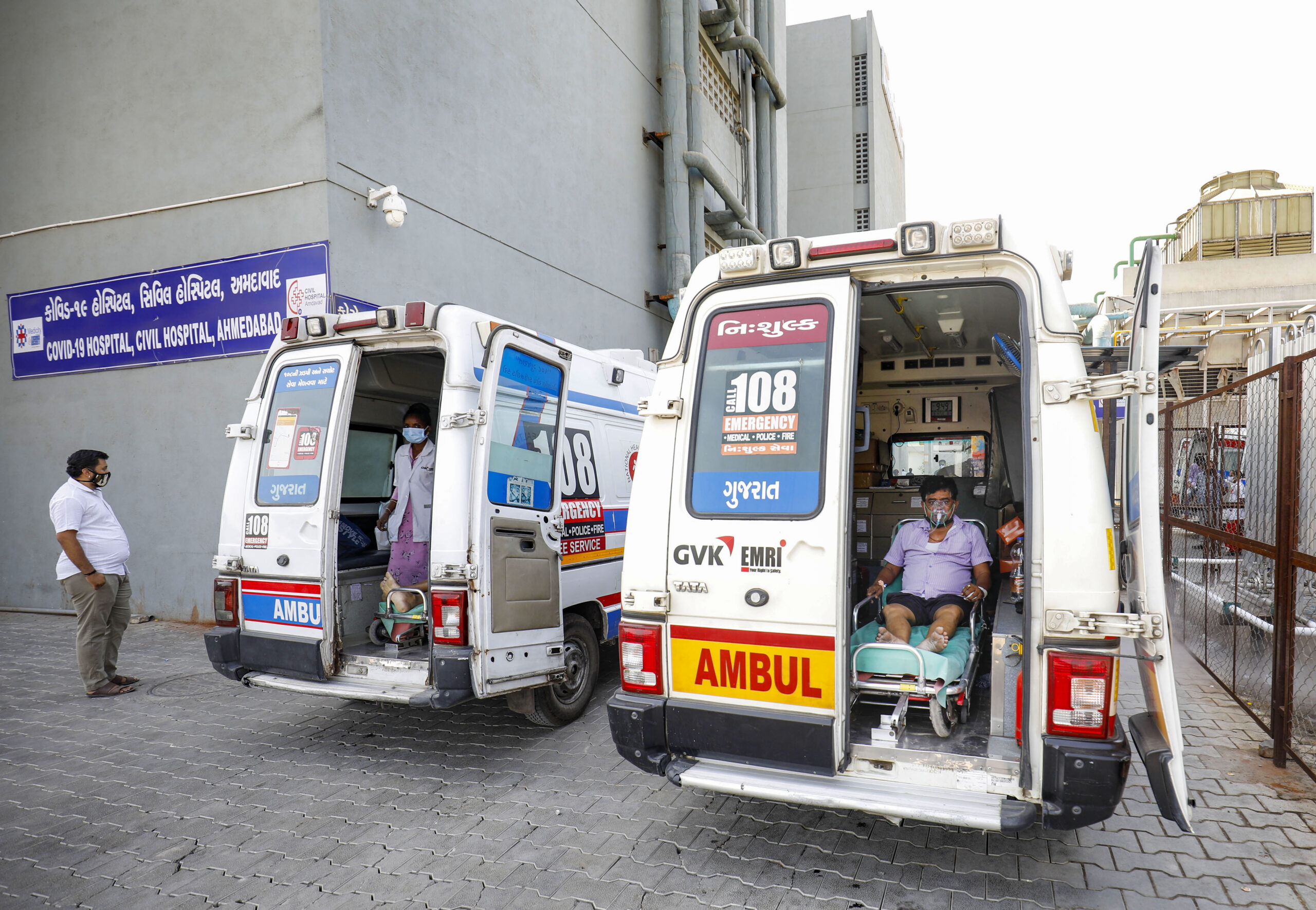 અમદાવાદમાં કોરોનાના કેસોમાં વધારાને પગલે કોરોના દર્દીઓને લઇને એબ્યુલન્સ જઈ રહી છે અને દર્દીને દાખલ કરવા માટે રાહ જોઇ રહી છે. (PTI Photo)