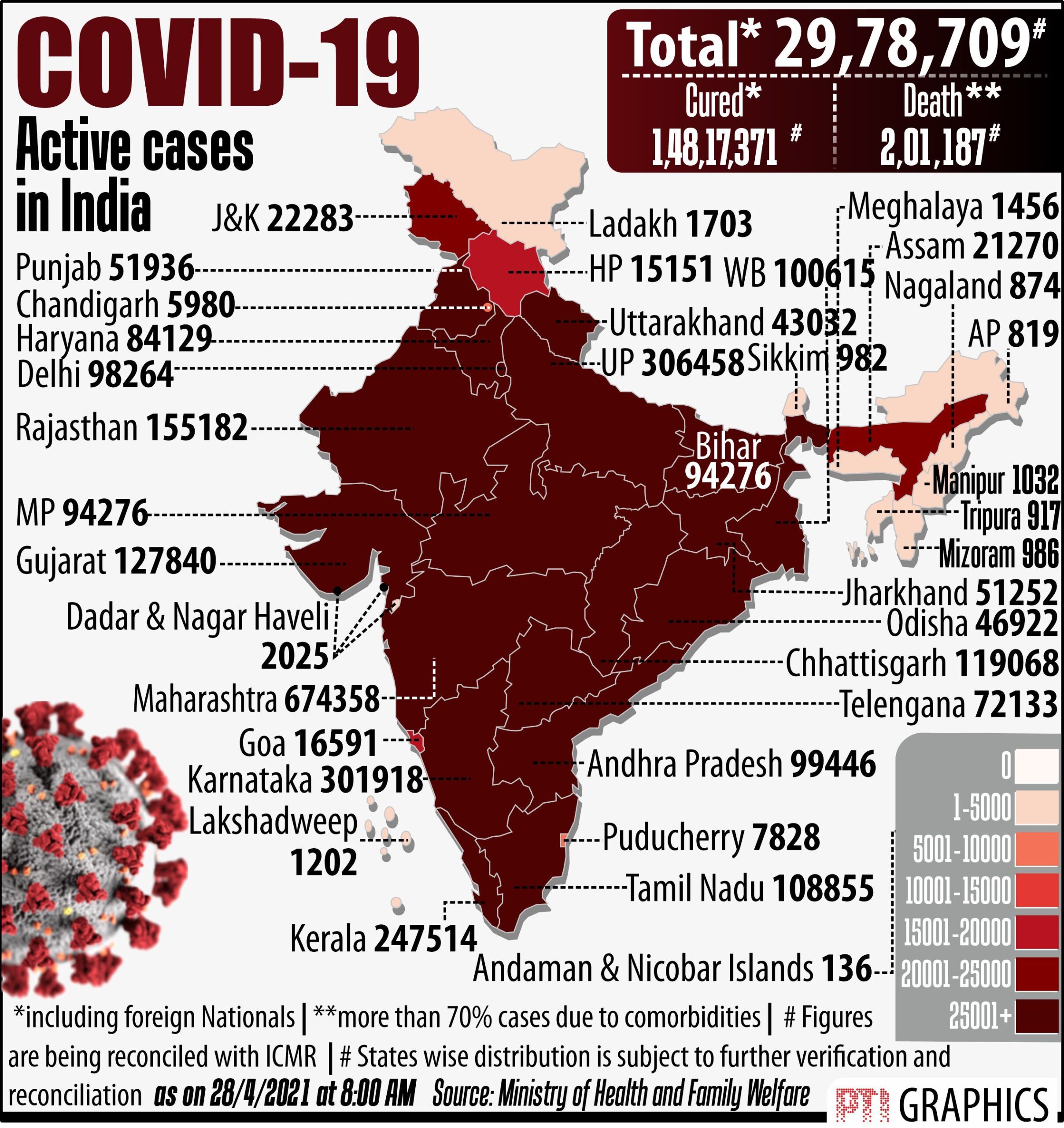 રાષ્ટ્રીય રિકવરી રેટ ઘટીને 82.33 ટકા થયો હતો. દેશમાં કોરોનાથી અત્યાર સુધી 2,01,187 લોકોના મોત થયા છે. મંગળવારે થયેલા કુલ 3,293 મોતમાંથી મહારાષ્ટ્રમાં 895 લોકો, દિલ્હીમાં 381 લોકો, ઉત્તરપ્રદેશમાં 264 લોકો, છત્તીસગઢમાં 246, કર્ણાટકમાં 180 અને ગુજરાતમાં 170 લોકોના મોત થયા હતા.