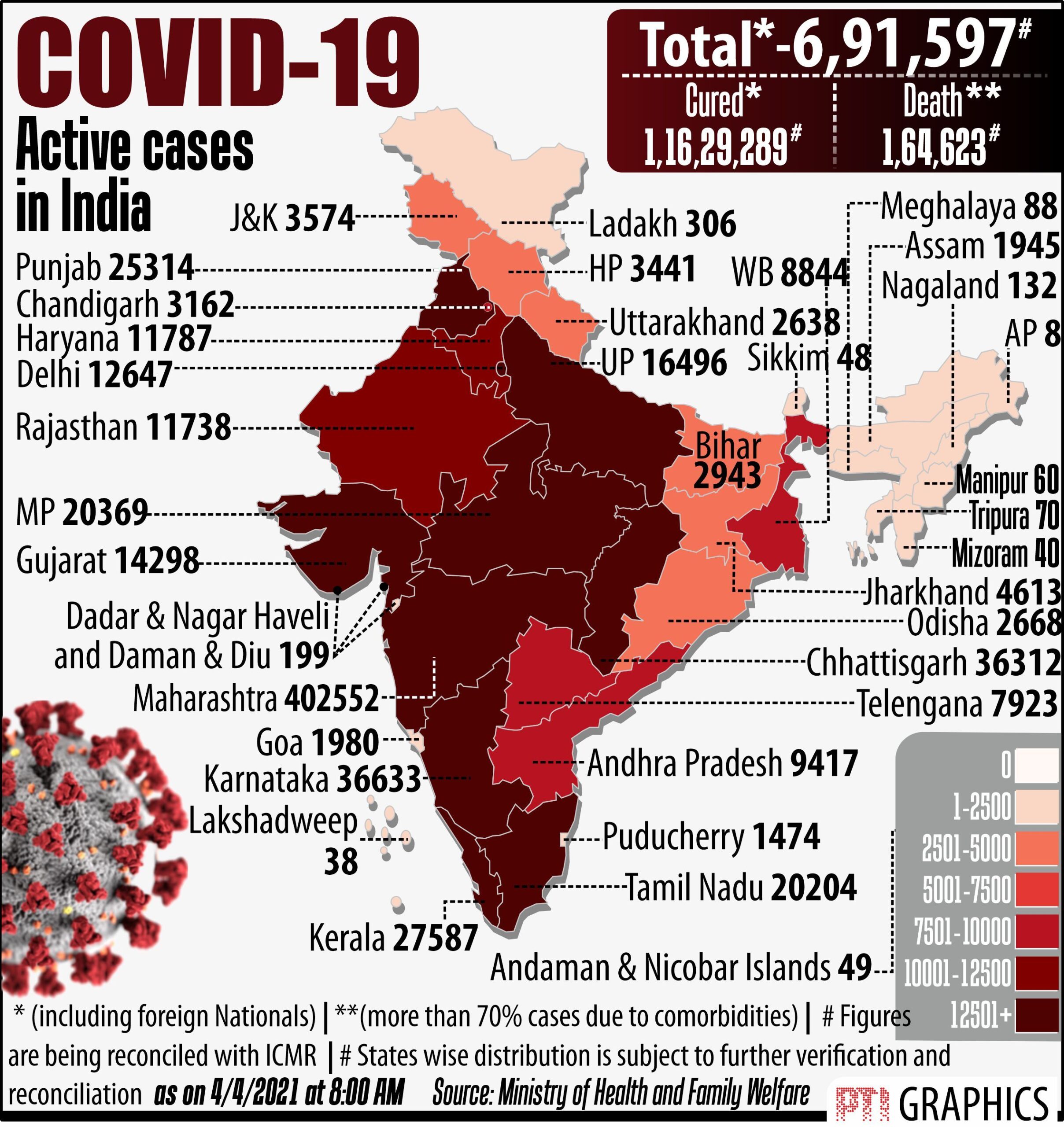 દેશના કોરોના દૈનિક કેસમાંથી આશરે 81.90 ટકા કેસો આઠ રાજ્યોમાં નોંધાયા હતા. દેશમાં નોંધાયેલા કુલ કેસમાંથી 55.11 ટકા કેસ મહારાષ્ટ્રમાં નોંધાયા હતા.પાંચ રાજ્યોમાં વિધાનસભાની ચૂંટણીને પગલે દેશમાં કોરોના વાઇરસના ફેલાવમાં વધારો થવાનું પણ જોખમ છે. દેશના સૌથી વધુ અસરગ્રસ્ત મહારાષ્ટ્રમાં હોસ્પિટલો દર્દીઓથી ઉભરાઈ રહી છે. દેશના સૌથી વધુ ઔદ્યોગિક રાજ્ય મહારાષ્ટ્રમાં એક દિવસમાં 57,074 નવા કેસ નોંધાયા હતા.