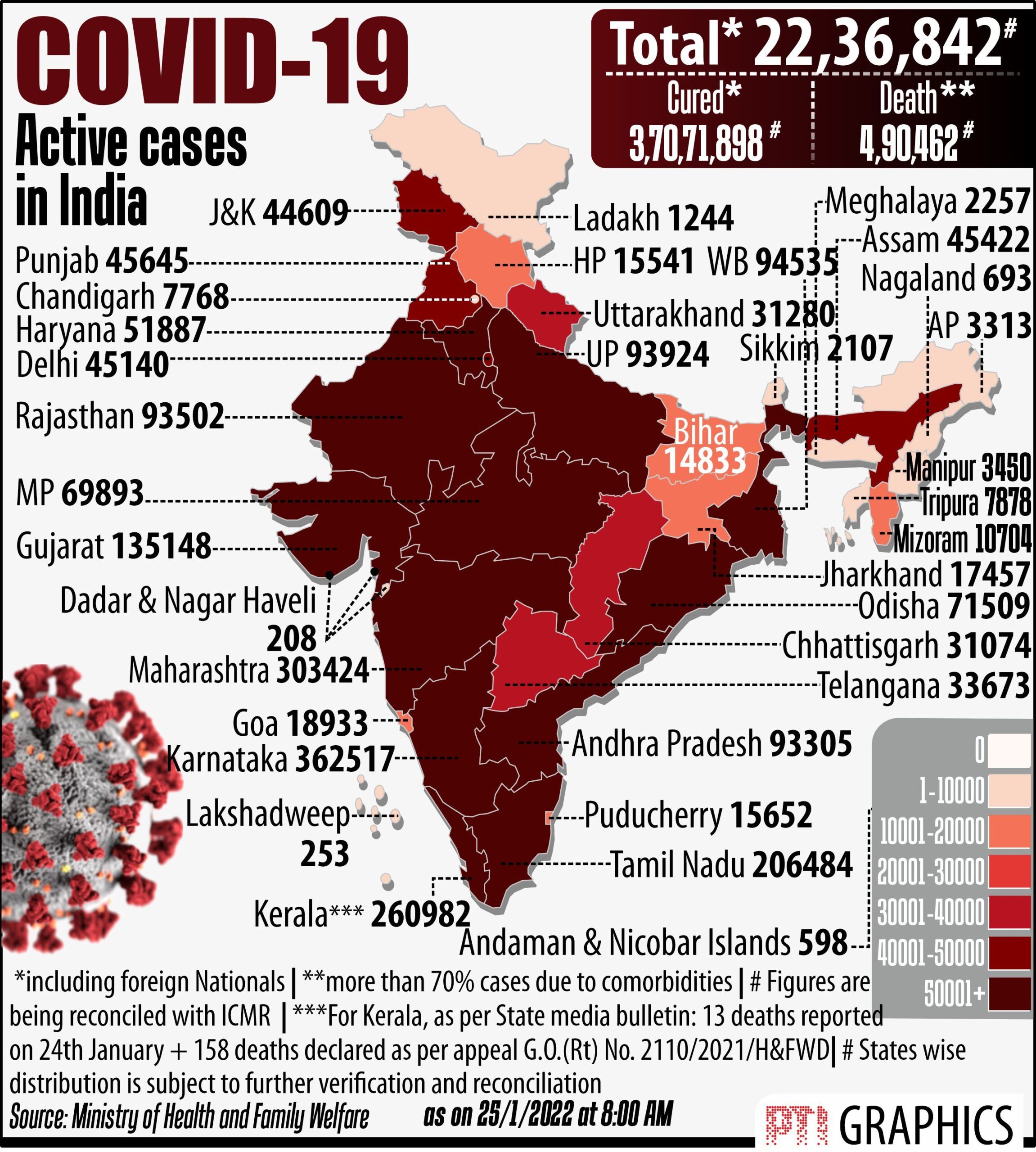 ભારતનું કોવિડ-19 રસીકરણ કવરેજ મંગળવાર સવાર સુધીમાં 162.26 કરોડના આંકડાને પાર કરી ગયું છે. ભારતમાં મહામારીની શરૂઆતથી આજદિન સુધીમાં કોવિડ-19ના કુલ પોઝિટીવ થયેલા કેસમાંથી 3,68,04,145 દર્દીઓ સાજા થઇ ગયા છે અને છેલ્લા 24 કલાકમાં વધુ 2,43,495 દર્દીઓ સાજા થયા છે. આના કારણે એકંદરે સાજા થવાનો દર 93.07 ટકા થયો છે. છેલ્લા 24 કલાકમાં ભારતમાં કોરોનાના દૈનિક 3,06,064 નવા કેસ નોંધાયા છે. જ્યારે સક્રિય કેસનું ભારણ 22,49,335 છે, જે દેશના કુલ પોઝિટિવ કેસોના 5.69 ટકા છે.