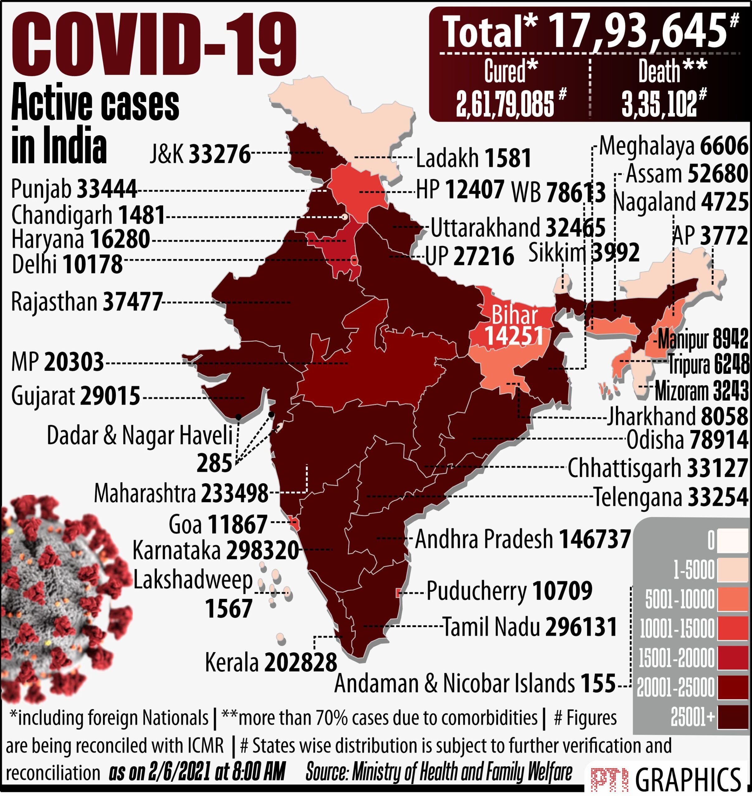 આરોગ્ય મંત્રાલયે બુધવારે સવારે જારી કરેલા ડેટા મુજબ છેલ્લાં 24 કલાકમાં વધુ 2,11,499 દર્દીઓ સાજા થયા હતા, જેની સાથે કુલ સાજા થયેલા દર્દીઓની સંખ્યા 2,63,90,584 થઈ ગઈ હતી. નવા કેસની સામે સાજા થનારા દર્દીઓની સંખ્યા વધવાના કારણે એક્ટિવ કેસમાં મોટો ઘટાડો નોંધાઈ રહ્યો છે. દેશમાં એક્ટિવ કેસની સંખ્યા ઘટીને 17,13,413 થઈ હતી.