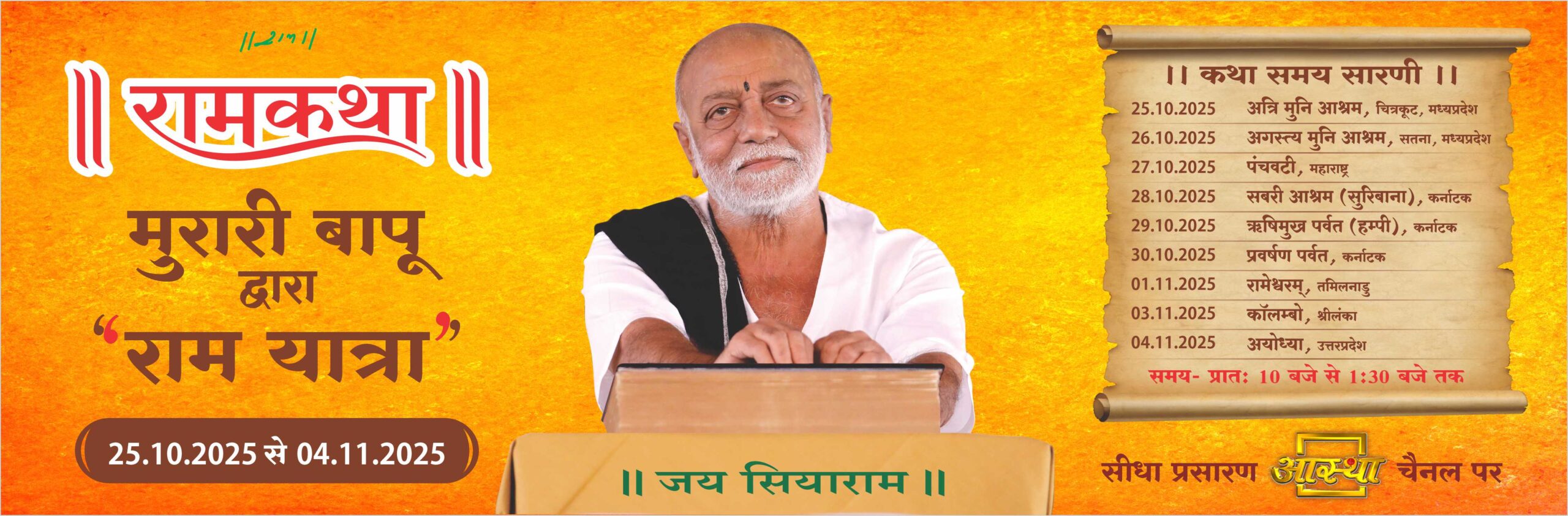 અયોધ્યાથી શ્રીલંકા સુધીના ભગવાન શ્રી રામની યાત્રાના સ્થાનોને ક્રમશઃ સાંકળતો રામકથા ગાન સાથેનો દિવ્ય ઉપક્રમ શ્રી મોરારિબાપુ દ્વારા યોજાનાર છે. આ ‘રામયાત્રા’ ઉપક્રમ વિગત મુજબ શનિવાર તા.૨૫થી મંગળવાર તા.૪ દરમિયાન વિવિધ સ્થાનો પર કથાગાન થશે. શનિવાર તા.૨૫ અત્રિ મુનિ આશ્રમ, ચિત્રકુટ, રવિવાર તા.૨૬ અગસ્ત્ય મુનિ આશ્રમ, સતના, સોમવાર તા.૨૭ પંચવટી, મંગળવાર તા.૨૮ સબરી આશ્રમ, સુરિબાના, બુધવાર તા.૨૯ ઋષિમુખ પર્વત, હમ્પી, ગુરુવાર તા.૩૦ પ્રવર્ષણ પર્વત, શનિવાર તા.૧ રામેશ્વરમ અને ત્યાંથી સોમવાર તા.૩ કોલંબો શ્રીલંકા થઈને મંગળવાર તા.૪ અયોધ્યા રામકથા પહોંચશે.
