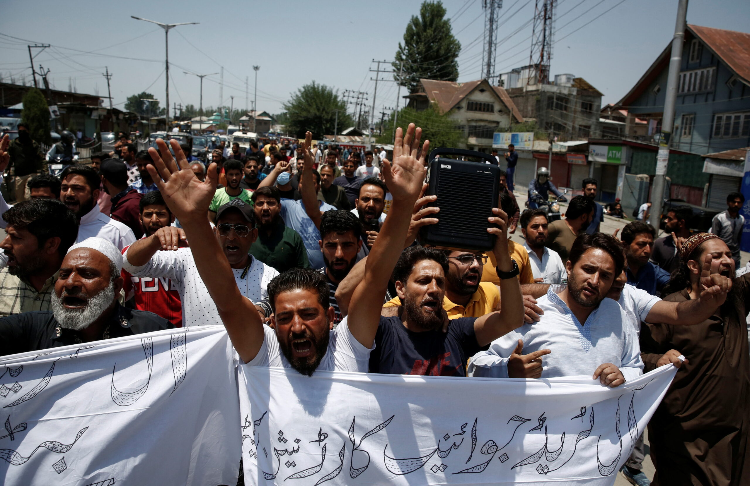 મહંમદ પયગંબર સાહેબ અંગેની ભાજપના બે નેતાઓની વિવાદાસ્પદ ટીપ્પણીના વિરુદ્ધમાં શ્રીનગરમાં વિરોધી દેખાવો કર્યા હતા. REUTERS/Danish Ismail