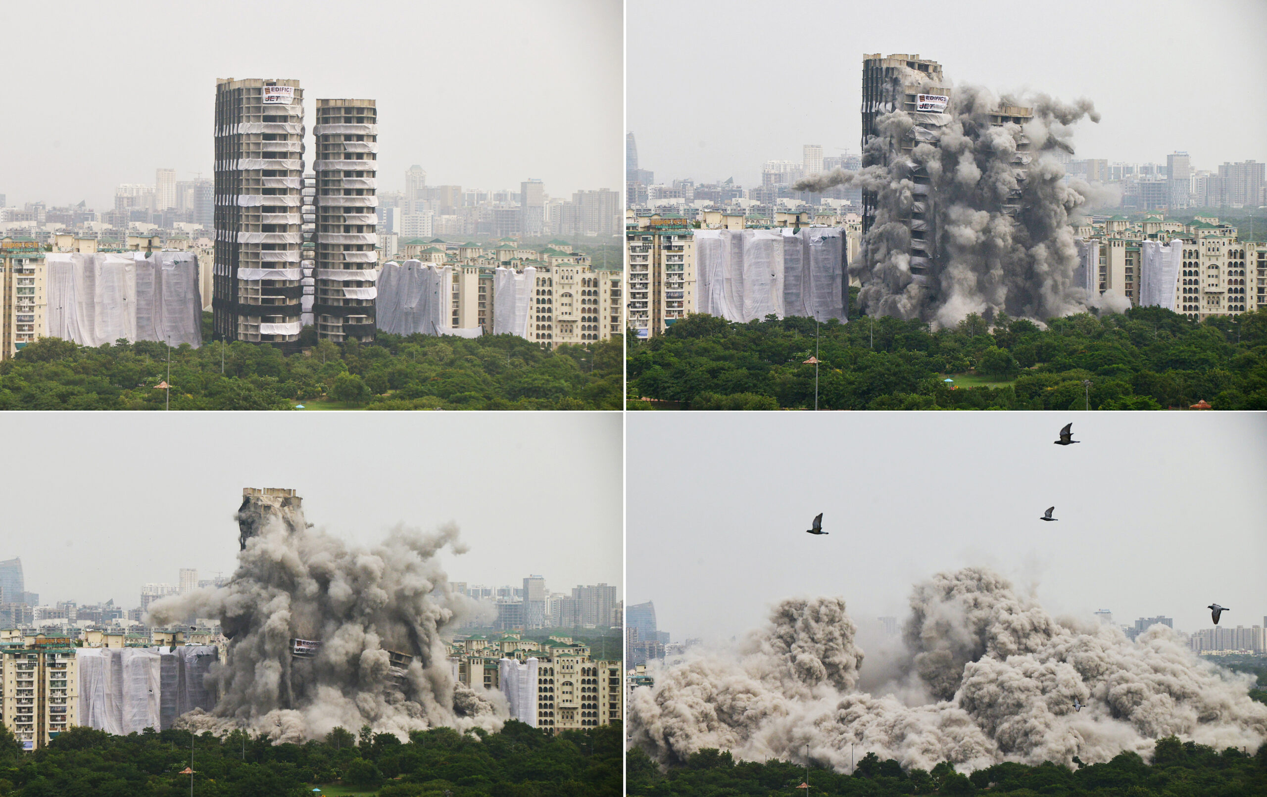 સુપ્રીમ કોર્ટના આદેશને પગલે નોઇડા ખાતેના આશરે 100 મીટર ઊંચા ગેરકાયદે ટ્વીન ટાવર્સ રવિવારે બપોરે 2.30 કલાકે આશરે 3,700 કિગ્રા વિસ્ફોટકોનો ઉપયોગ કરી સુરક્ષિત રીતે જમીનદોસ્ત કરવામાં આવ્યા હતા. પત્તાના મહેલની જેમ 9 સેકન્ડથી ઓછા સમય ટ્વીન ટાવર ધ્વંસ થતા જ ધૂળના ગોટેગોટા ઉડ્યા હતા. નોઇડા ઓથોરિટી સામેનો હવેનો પડકાર આશરે 55,000 ટન કાટમાળને દૂર કરવાનો છે. કાટમાળ દૂર કરતા આશરે ત્રણ મહિનાનો સમય લાગી શકે છે.