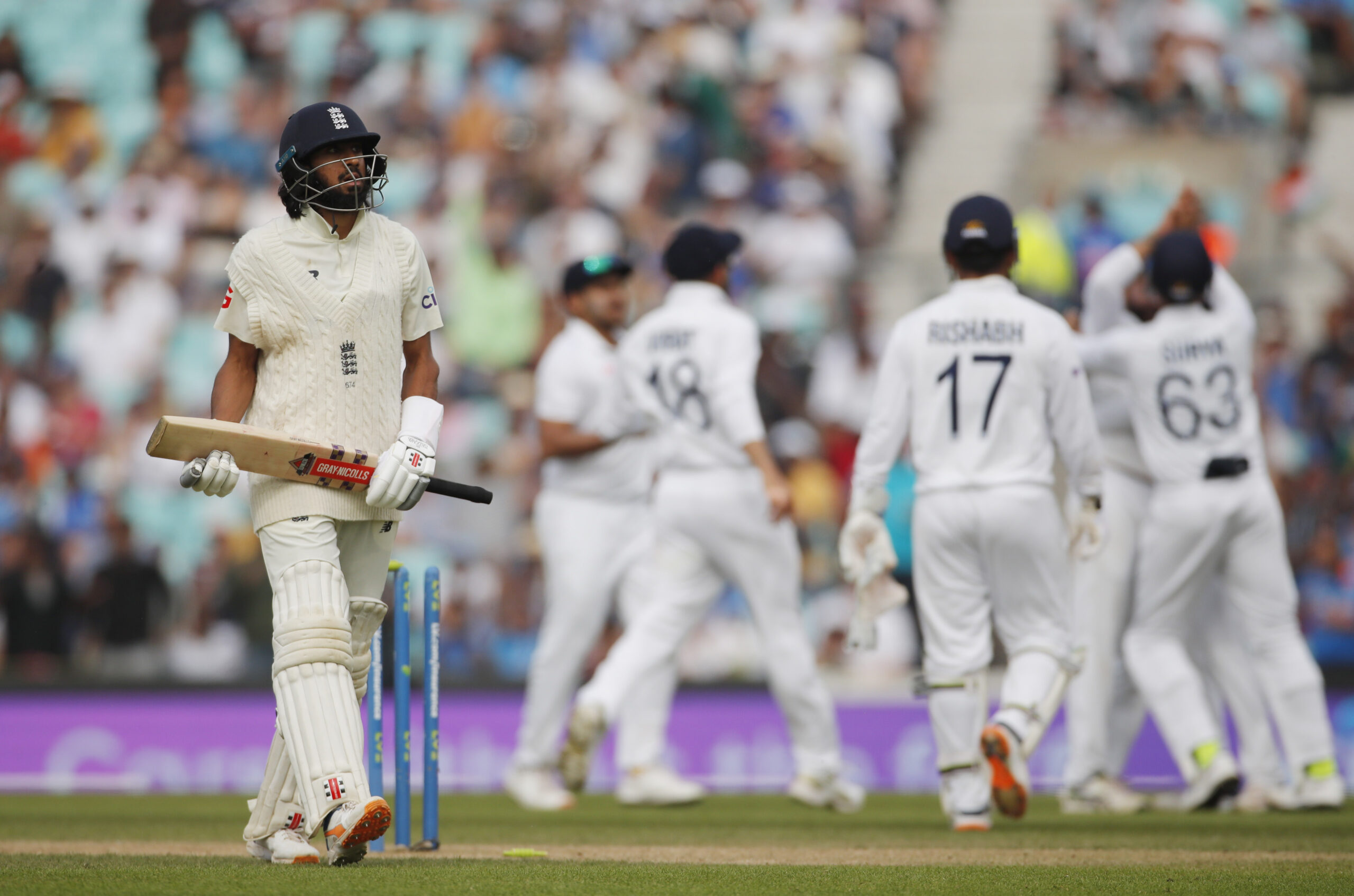 ઓવલ ટેસ્ટના પાંચમા દિવસે ઈંગ્લેન્ડના ઓપનિંગ બેટ્સમેન રોરી બર્ન્સ અને હસીબ હમીદે ઈનિંગ આગળ ધપાવી હતી અને 100 રનની ભાગીદારી કરી હતી. બર્ન્સે અડધી સદી પણ ફટકારી હતી. ત્યારબાદ શાર્દુલ ઠાકુરને ઓપનિંગ જોડી તોડવામાં સફળતા મળી હતી. વન-ડાઉન બેટિંગમાં આવેલા ડેવિડ મલાન (5) રન કરી આઉટ થઈ ગયો હતો. બીજા સેશનમાં ઈંગ્લેન્ડના કેપ્ટન જો રૂટે હસીબ સાથે સ્કોરબોર્ડ આગળ ધપાવ્યો હતો. સ્પિનર રવિન્દ્ર જાડેજાએ હસીબ હમીદ (63)ની વિકેટ ઝડપી હતી. ત્યારબાદ બુમરાહે ઓલી પોપ (2)ને પેવેલિયન પરત મોકલ્યો હતો. બુમરાહે આ સાથે જ ટેસ્ટ ક્રિકેટમાં તેની 100 વિકેટ પૂર્ણ કરી હતી. બુમરાહનો તરખાટ યથાવત રહ્યો હતો અને તેણે જોની બેરસ્ટોને ખાતું ખોલ્યા વગર જ પેવેલિયનનો રસ્તો બતાવ્યો હતો. બીજા છેડેથી રવિન્દ્ર જાડેજાએ બીજી જ ઓવરમાં મોઈલ અલીને આઉટ કર્યો હતો.