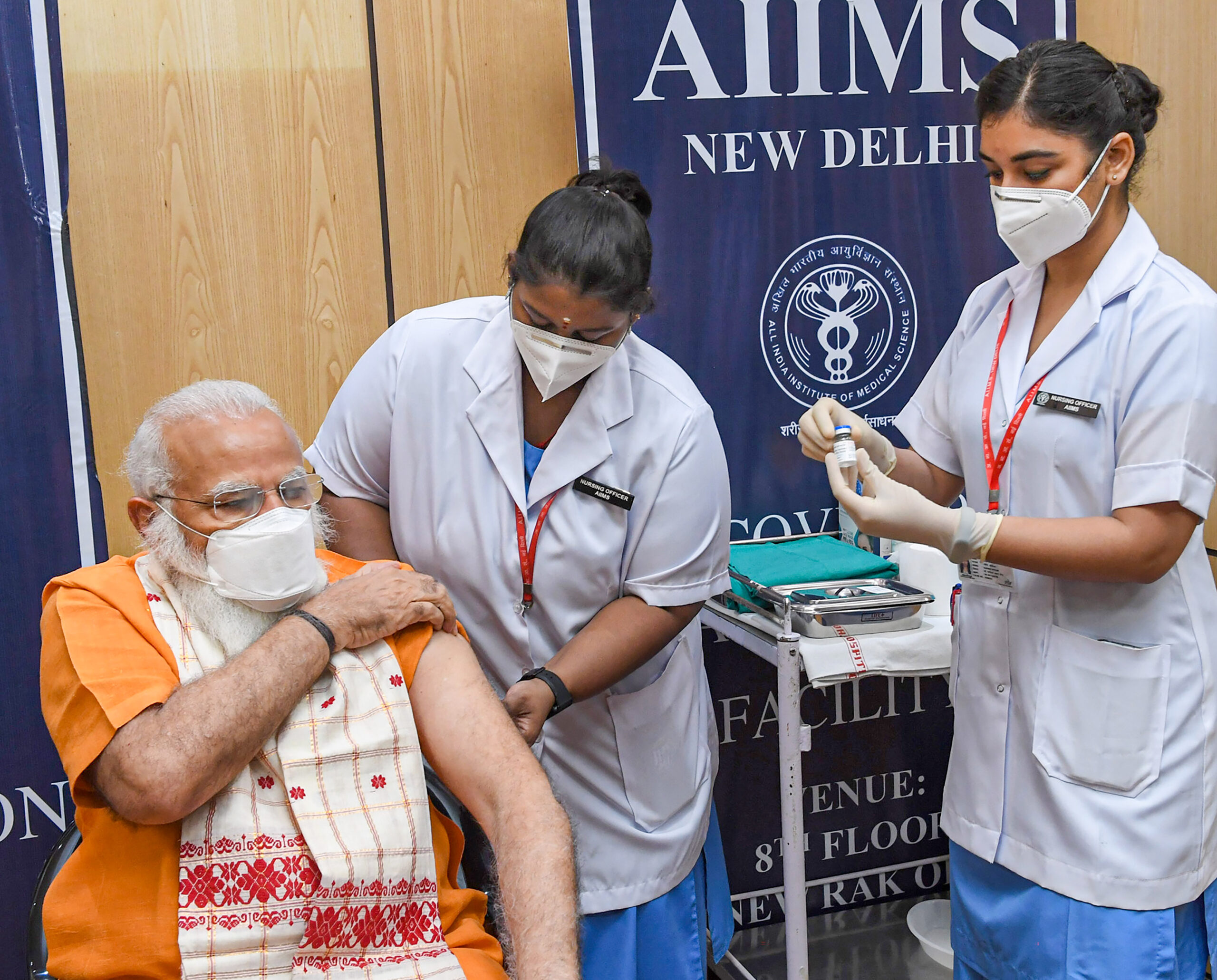 ભારત વડાપ્રધાન નરેન્દ્ર મોદીએ ગુરુવારે કોરોનાની રસીનો બીજો ડોઝ લીધો હતો. તેઓ સવારે રસી લેવા માટે દિલ્હીની એમ્સ હોસ્પિટલ ખાતે પહોંચ્યા હતા. મોદી ભારત બાયોટેક દ્વારા વિકસિત સ્વદેશી કોવેક્સીનનો ડોઝ લીધો હતો. પહેલી વખત તેમને પુડિચેરીની નર્સ પી નિવેદાએ વેક્સીન મુકી હતી અને ગુરુવારે પંજાબની નર્સ નિશા શર્માએ તેમને વેક્સીનનો બીજો ડોઝ આપ્યો હતો. અગાઉ વડાપ્રધાન મોદીને રસી આપનાર સિસ્ટર નિવેદા આજે પણ હાજર રહ્યા હતા.વડાપ્રધાન મોદીએ અગાઉ પહેલી માર્ચે વેક્સીનનો પ્રથમ ડોઝ લીધી હતી.