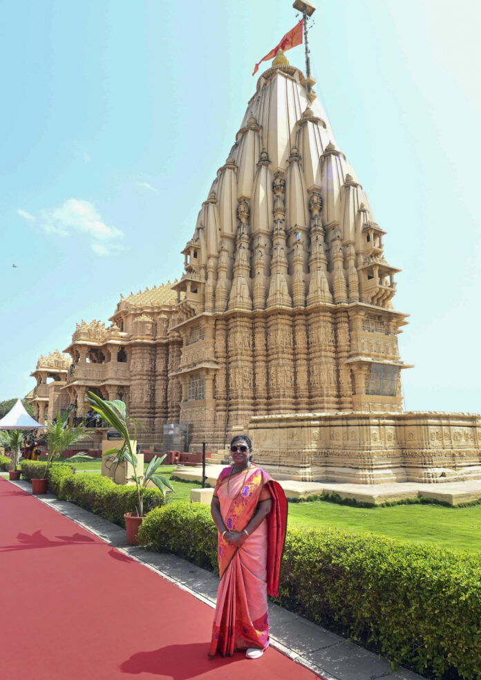 ૧૦ ઓક્ટોબરે રાષ્ટ્રપતિએ ગીર સોમનાથ જિલ્લામાં આવેલા પ્રખ્યાત સોમનાથ મહાદેવ મંદિરમાં દર્શન અને આરતી કરી હતી. વેરાવળ શહેર નજીક ભગવાન શિવને સમર્પિત 12 જ્યોતિર્લિંગોમાંના એક, સોમનાથ મહાદેવ મંદિરમાં તેમણે ગંગાનું પવિત્ર જળ અર્પણ કર્યું અને દૈવી મંત્રોના જાપ વચ્ચે ‘સોમેશ્વર મહાપૂજા’ કરી હતી. રાષ્ટ્રપતિ મુર્મુએ મંદિર પરિસરમાં સ્થાપિત સરદાર વલ્લભભાઈ પટેલની પ્રતિમા પર પુષ્પાંજલિ પણ અર્પણ કરી હતી.