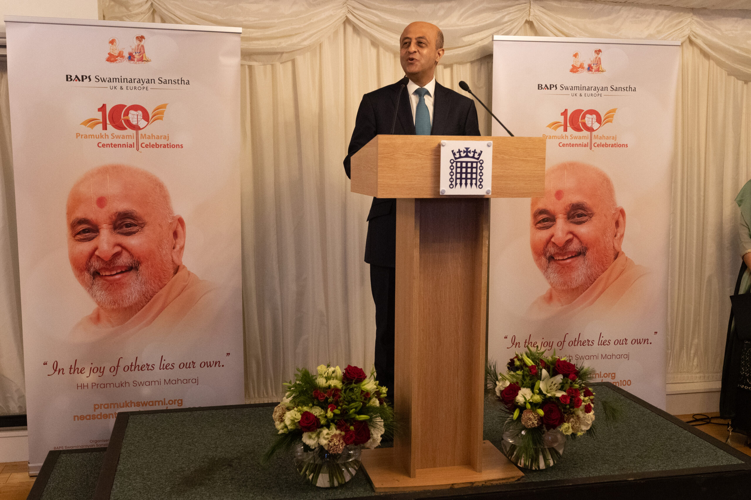 ણાવ્યું હતું કે ‘’આપણા સમયના મહાન ધાર્મિક નેતાઓમાંના એક પ. પૂ. પ્રમુખસ્વામી મહારાજની જન્મ શતાબ્દી નિમિત્તે BAPS સાથે સહયોગ કરવો એ ખૂબ જ સન્માનની વાત છે. આજ હાઉસ ઓફ કોમન્સમાં પૂ. પ્રમુખ સ્વામીનું 1988માં ઉપરના માળે આવેલા કમિટી રૂમમાં સાંસદો દ્વારા સન્માન કરાયું હતું. ગત સમરમાં નીસડન મંદિર ખાતે 10-દિવસીય પ્રેરણા ઉત્સવનું પણ આયોજન કરાયું હતું. આપણે અહીં લંડનમાં ઉજવણી કરીએ છીએ તેમ અમદાવાદમાં એક વધુ મોટો સ્મૃતિ સમારંભ ચાલી રહ્યો છે. એક મહિનાના એક્સ્ટ્રાવેગેન્ઝા ઉત્સવનું ઉદઘાટન ગયા અઠવાડિયે ભારતના વડા પ્રધાન નરેન્દ્ર મોદીએ કર્યું હતું. આજે, મને આનંદ છે કે આપણા વડાપ્રધાન ઋષિ સુનકે પણ આ માટે ખાસ રેકોર્ડ કરેલ સંદેશ અહિં રજૂ કરી શકીએ છે.’’