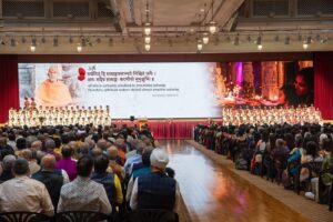 રાજા અને રાણી મુખ્ય સભા ખંડમાં પ્રવેશ્યા ત્યારે ઉપસ્થિત સૌએ ઉભા થઇને શાહી દંપતીનું તાળીઓના ગડગડાટ સાથે સ્વાગત કર્યું હતું. તો પરંપરાગત ભારતીય પોશાક પહેરેલા કિશોર કિશોરીઓએ BAPSના ધ્વજ લહેરાવ્યા હતા.