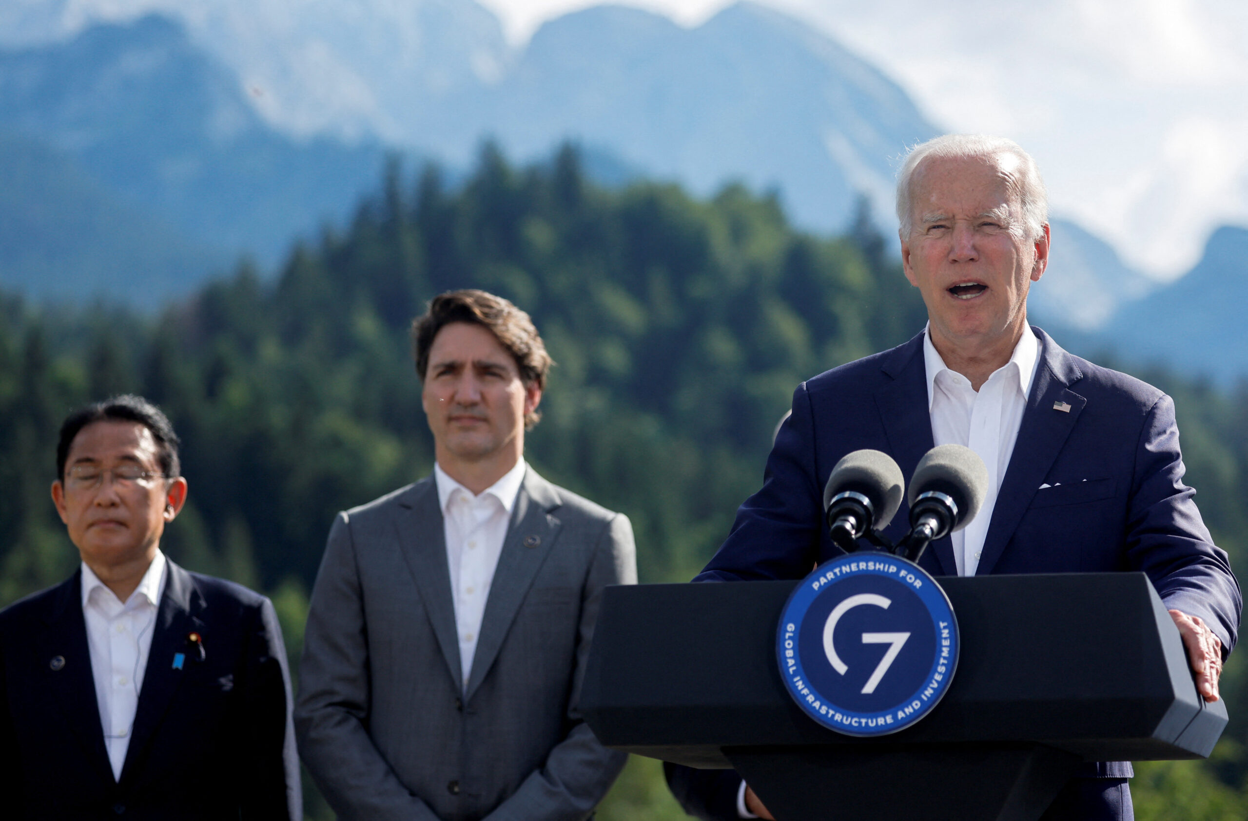 જર્મનીમાં જી-સેવન દેશોની શિખર બેઠકના પ્રથમ દિવસે યુએસ પ્રેસિડન્ટ બોલી રહ્યાં છે. તેમની સાથે જાપાનના વડાપ્રધાન ફુમિયો કિશિડા અને કેનેડાના વડાપ્રધાન જસ્ટિન ટ્રુડો છે. REUTERS/Jonathan Ernst/Pool