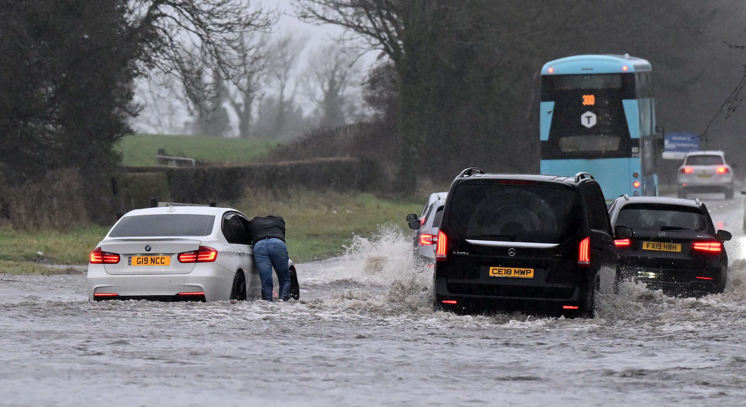 ANTRIM, NORTHERN IRELAND - JANUARY 27: A motorist whose car's engine has flooded pushes his car through heavy flooding near Belfast International airport on January 27, 2026 in Antrim, Northern Ireland. Storm Chandra is causing widespread disruption across the UK and Ireland, marked by "danger to life" amber warnings for wind and rain. The storm has triggered severe flooding in the South West, particularly at the River Otter in Devon, while gusts of up to 80 mph have grounded flights in Northern Ireland and led to the closure of over 350 schools. (Photo by Charles McQuillan/Getty Images)