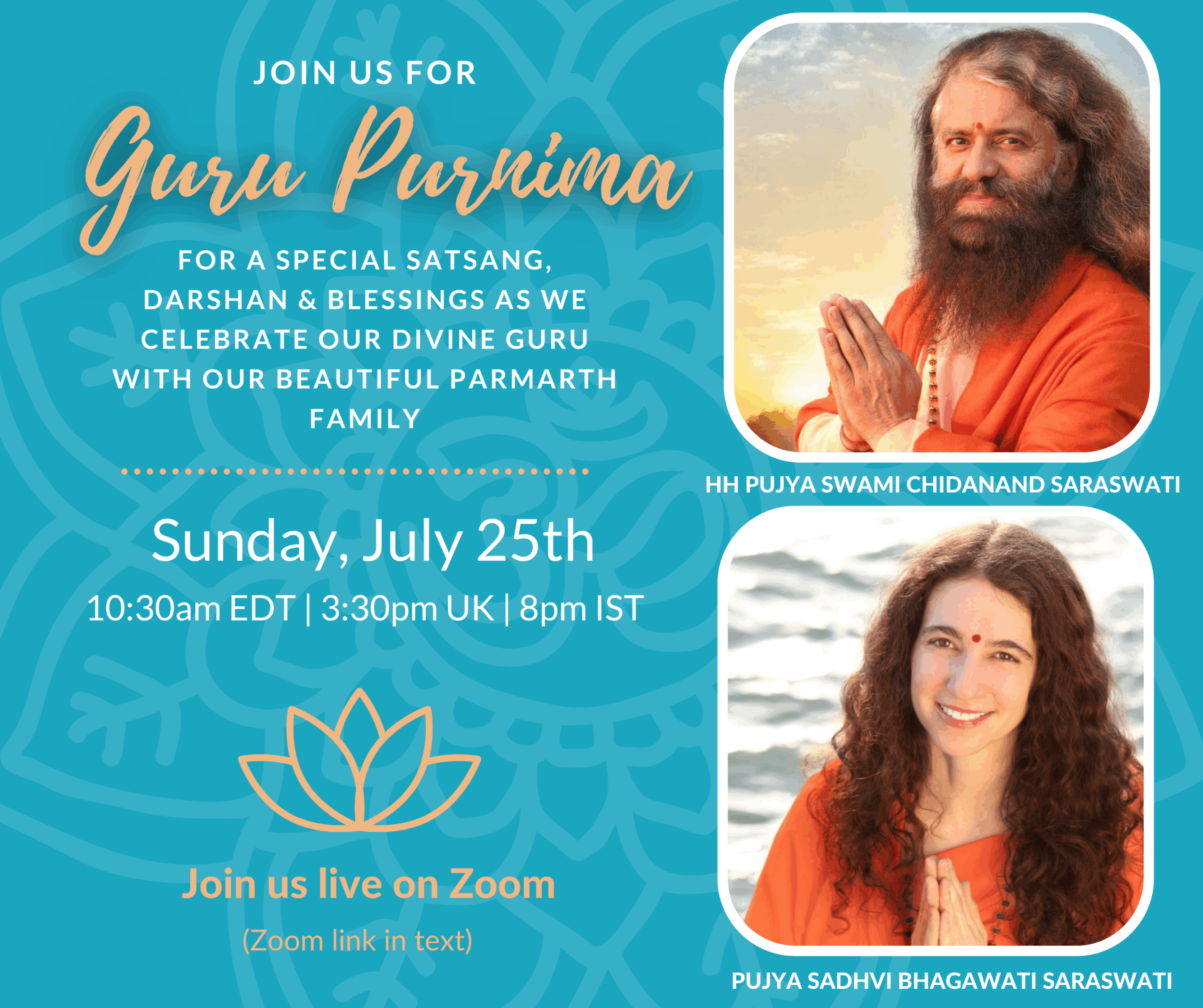 વિશ્વભરના દિવ્ય પરમાર્થ પરિવાર માટે પરમ પૂજ્ય સ્વામી ચિદાનંદ સરસ્વતી, મુનિજી અને પૂજ્ય સાધ્વી ભગવતી સરસ્વતીજી સાથે ખાસ ગુરુ પૂર્ણિમાની ઉજવણી ઓનલાઈનનું ઝૂમ કોલનું 25 જુલાઈ 2021ના રોજ આયોજન કરવામાં આવ્યું છે. ખાસ ગુરુ પૂર્ણિમાં ઝૂમ કોલનો સમય 10:30AM EST, 8PM IST, 3:30PM UK નિર્ધારિત કરવામાં આવ્યો છે.