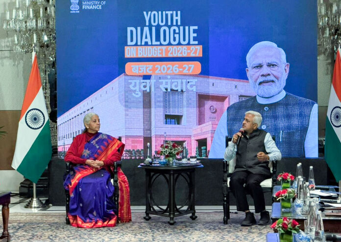 નવી દિલ્હીમાં બજેટ 2026 પર યુવા સંવાદ દરમિયાન કેન્દ્રીય નાણાં પ્રધાન નિર્મલા સીતારામન. (@nsitharamanoffc X/ANI Photo)