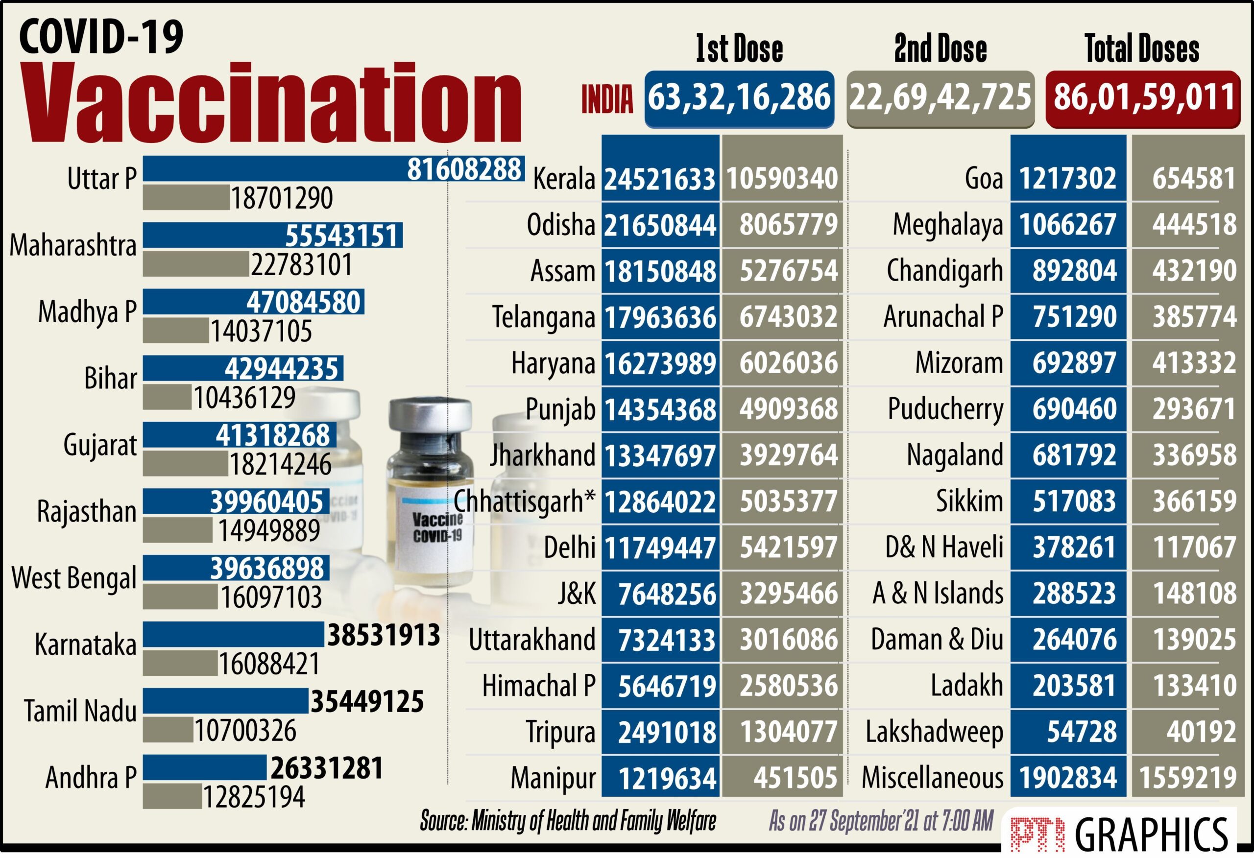 ભારતમાં રાષ્ટ્રવ્યાપી રસીકરણ અભિયાનના ભાગરૂપે 26 સપ્ટેમ્બર સુધીમાં કોરોના વેક્સિનના 85.60 કરોડ ડોઝ આપવામાં આવ્યા છે. ભારત સરકારે સોમવાર, 27 સપ્ટેમ્બરે જણાવ્યું હતું કે કેન્દ્ર સરકારે અત્યાર સુધી રાજ્યો અને કેન્દ્રી શાસિત પ્રદેશોને કોરોના વેક્સિનના કુલ 84.50 કરોડ ડોઝ આપ્યા છે અને આગામી થોડા દિવસમાં વધુ 21 લાખ ડોઝ આપવામાં આવશે. આરોગ્ય મંત્રાલયના જણાવ્યા અનુસાર રાજ્યો પાસે હાલમાં 4.74 કરોડ ડોઝ ઉપલબ્ધ છે.