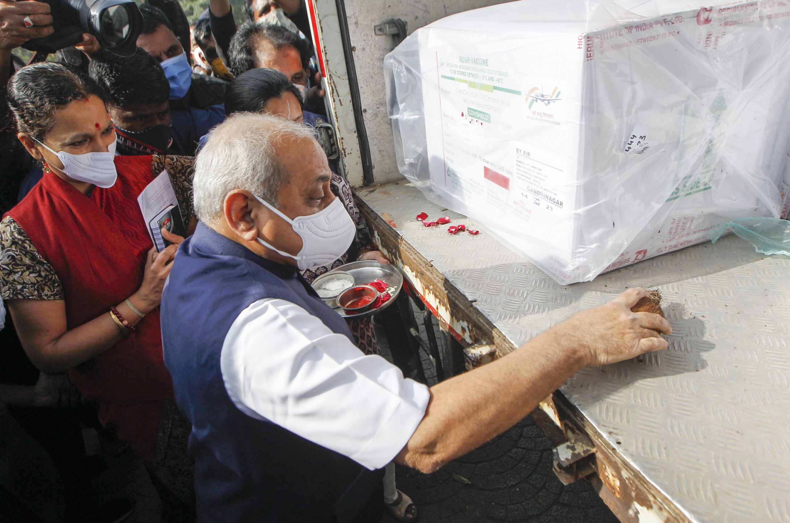 નીતિન પટેલે વેક્સિનને લીલીઝંડી આપ્યા બાદ વેક્સિનના જથ્થાને અમદાવાદ એરપોર્ટ પરથી અસારવા સિવિલ લઈ જવામાં આવ્યો હતો. રસીનો પ્રથમ ડોઝ ગાંધીનગર ઝોન, અમદાવાદ ઝોન અને ભાવનગર ઝોનને મોકલવામાં આવશે. 14-15 જાન્યુઆરીએ ગુજરાતના તમામ જિલ્લાઓમાં રસી મોકલી આપવામાં આવશે.